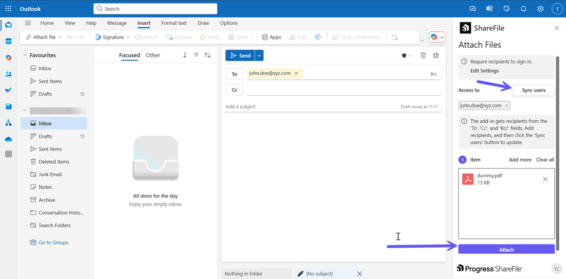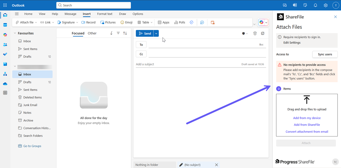 You need to first add the recipients in the mail and attach a file to the mail before converting attachments in Outlook.To attach files to emails for sending to email recipients, follow the Steps 1-5 in the above section. The Attach files menu will open with the attachment already converted by ShareFile.
