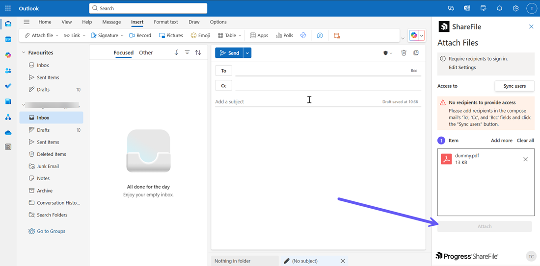 If there are no recipients to the mail, then the No recipients to provide access message is displayed and the Attach button is disabled by default as shown below: