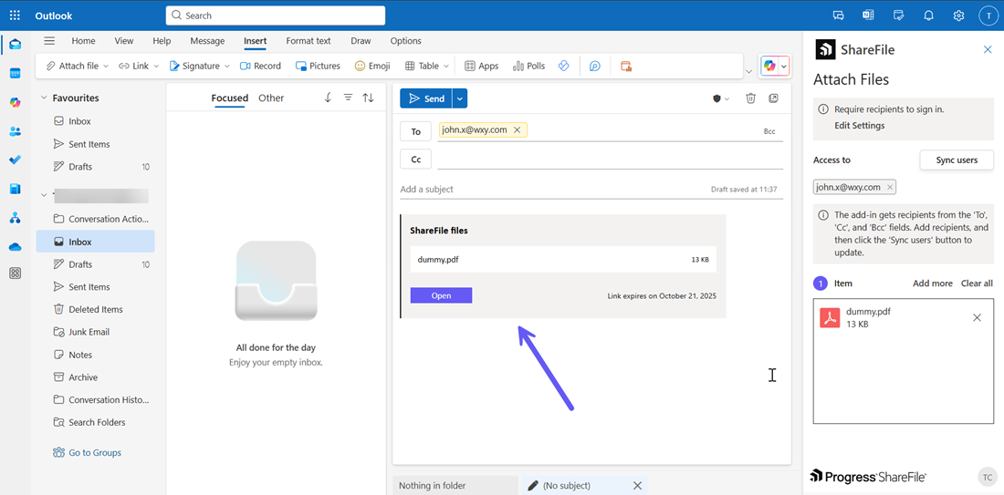 The attached file(s) will now be converted to a ShareFile link which will appear on the right pane as shown below: