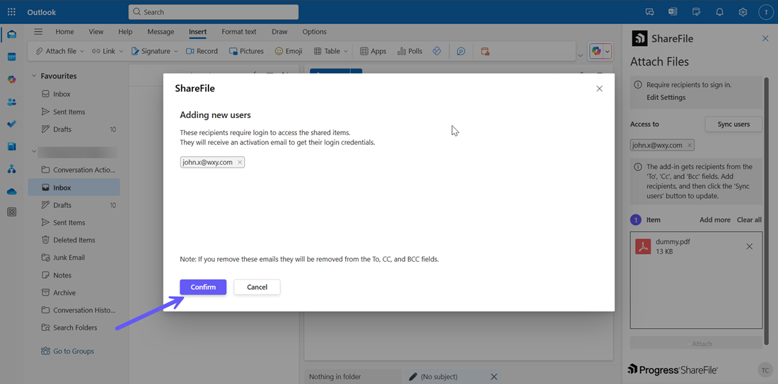 Click on the Attach button to create the ShareFile attachment link in the email. This will require all recipients to sign-in to view the attachments. If there are any users who do not have a ShareFile account, then an activation link will be sent to them and the Adding new users screen will open as shown below. Click on the Confirm button and the file will be attached.