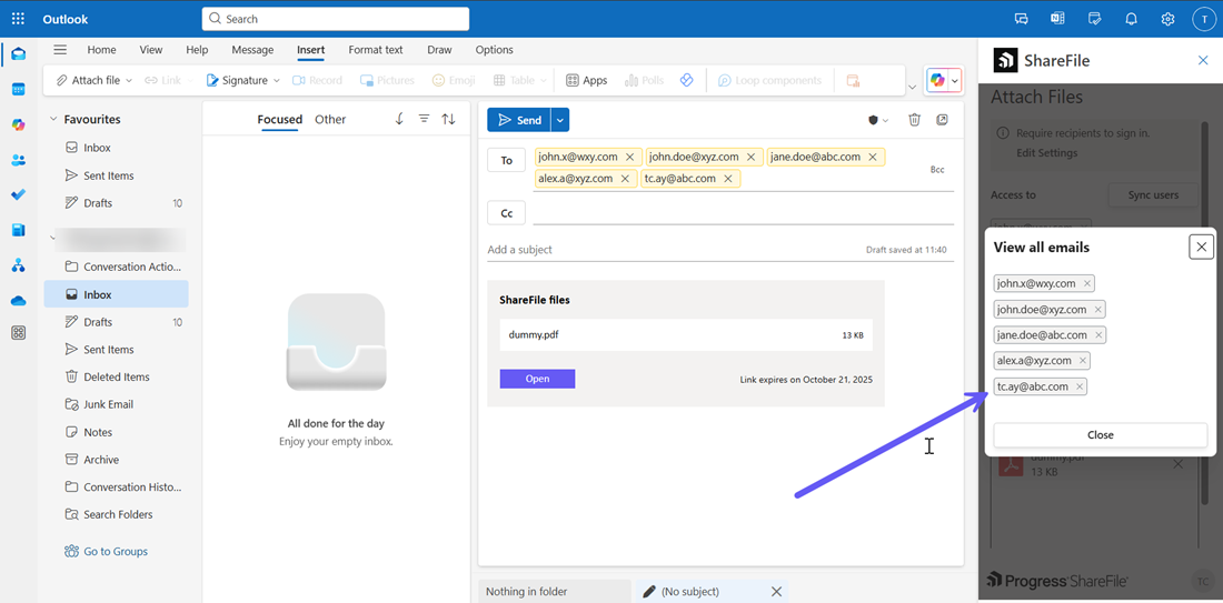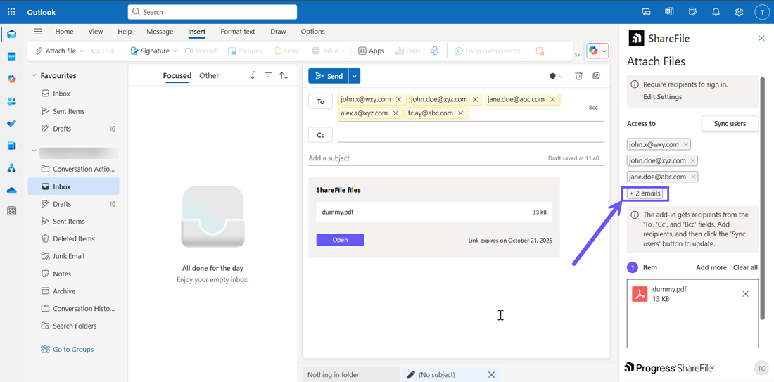 If there are too many email recipients in the mail, they will be displayed as shown above in the ShareFile pane. You can click on the +’n’emails option (where ‘n’ denotes the number of more email recipients to be viewed) to view all the email recipients as shown below: