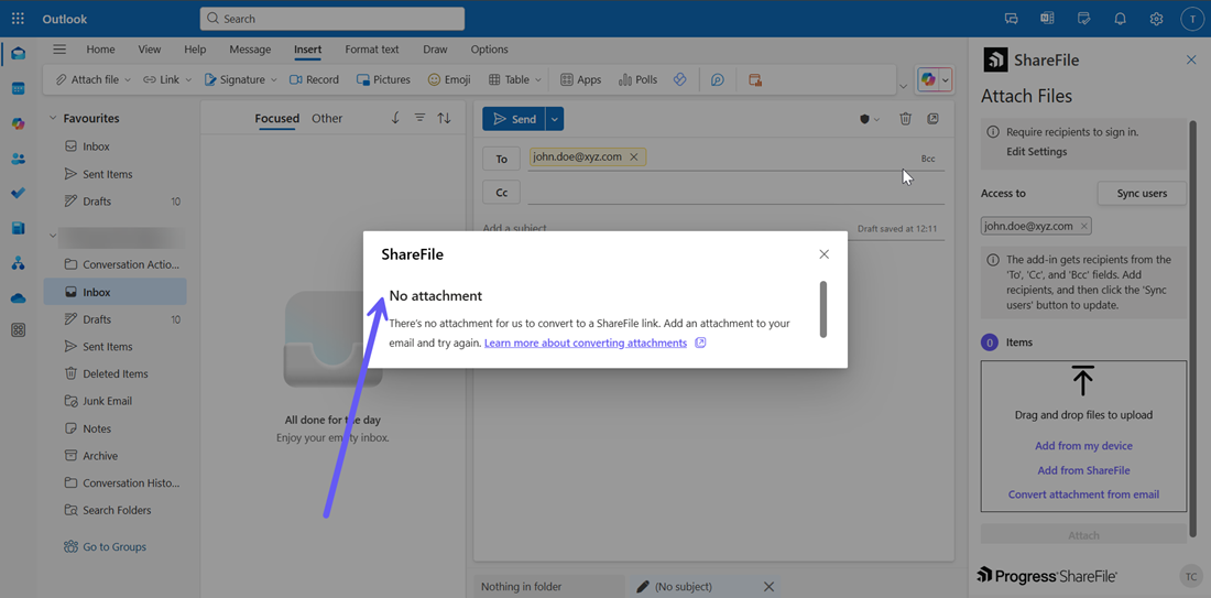 If there are no attachments in the email, then clicking on the Convert attachments button in the ShareFile menu will trigger a No attachment warning message as shown below: