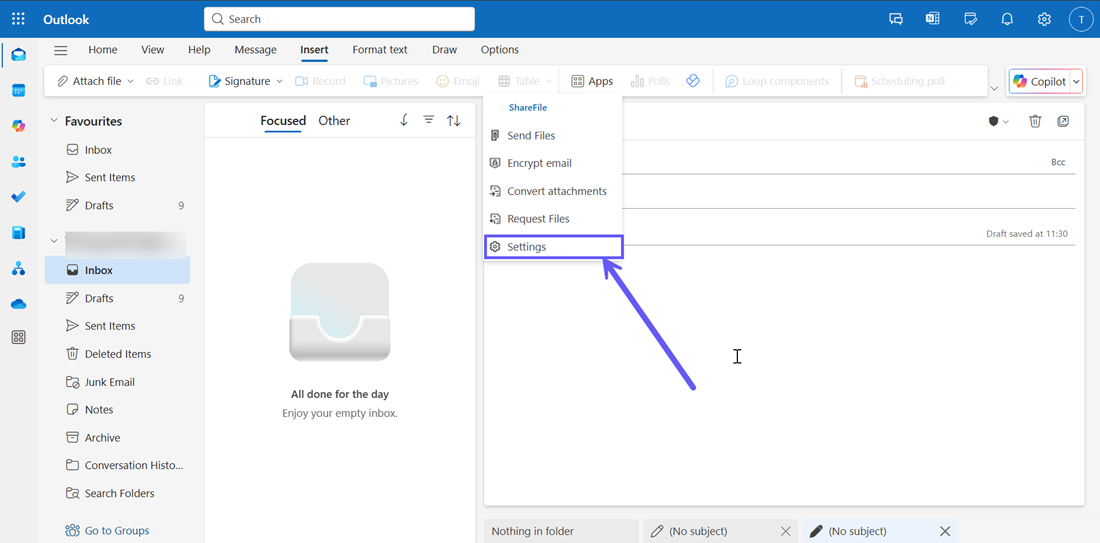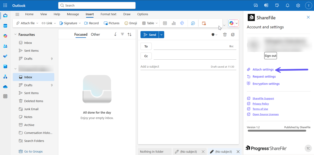 Select the ShareFile icon in the Outlook Online ribbon bar.