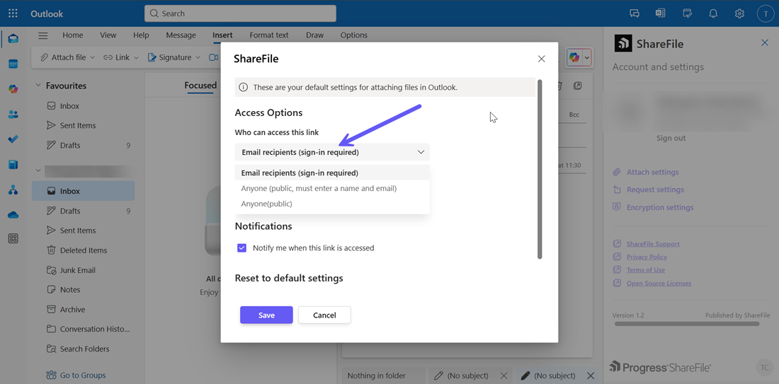 From the ShareFile settings menu, go to the Attach settings menu. From the Access options window that opens, go to the Who can access this link section and change the dropdown option to Email recipients (sign-in required) as shown below: